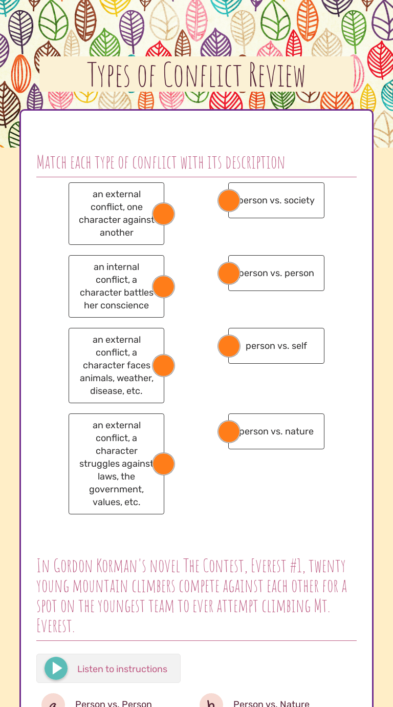 In this activity, students will examine both internal and external literary conflicts in the short story, the most dangerous game, and show them visually.