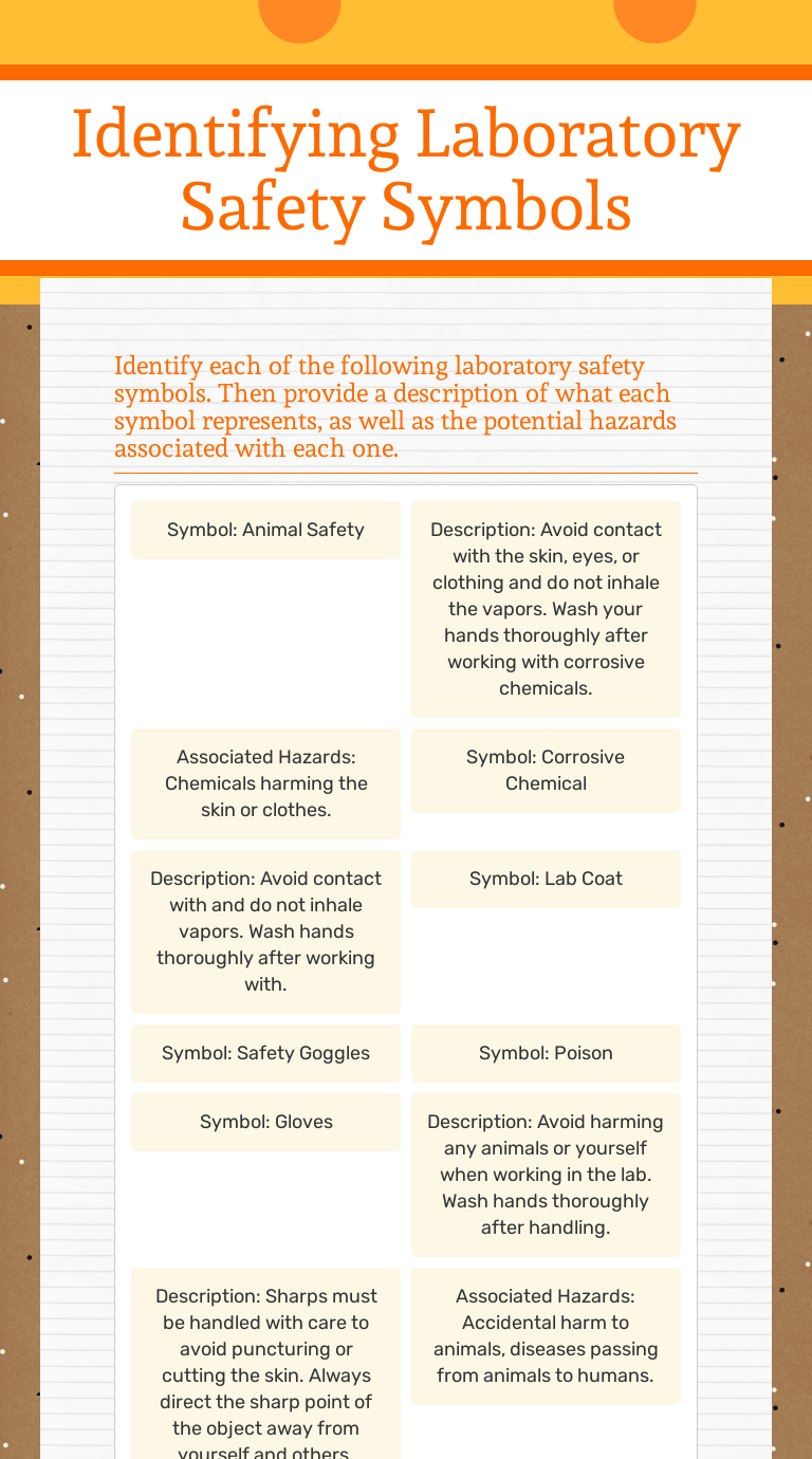 This symbol is used to alert students that materials will be heated . As you'd expect, it is a general warning to . Goggles must be worn when using glassware in the classroom or laboratory. 10) what is the hazard for a sharp object? Lab safety symbols warn you about potential hazards and help you learn what to look for when you're in the lab. Be aware of all safety symbols in the laboratory. The general warning lab safety symbol consists of a black exclamation point in a yellow triangle. Lab coats → protect the skin and clothes . Quickly find that inspire student learning. There is a printable worksheet available for download here so you can take the quiz with pen and paper. 7) what is the hazard from an open flame? Lab safety symbols worksheet physics chemistry common signs. We tried to locate some good of safety symbols worksheet with science laboratory safety and chemical hazard signs description .